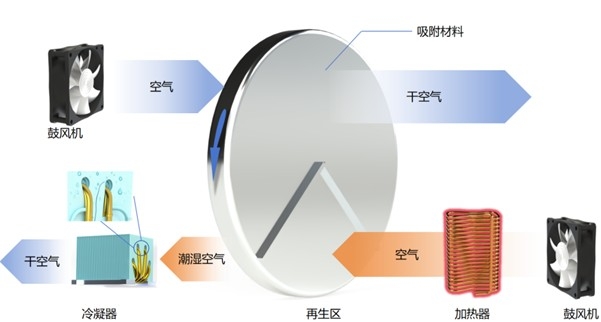转轮上涂布有吸湿MOF材料,转轮在转动过程中,不同部位依次循环经过吸附区和脱附区。在吸附区,含湿空气流经转轮,MOF材料主动捕捉并吸附空气中的水蒸气,干燥后的空气排出转轮。随后,转轮缓慢旋转,将吸附了水分的转轮的区域带入脱附区。在脱附区,通过低温加热(60-80℃),使MOF材料中的水蒸气释放出来。与传统吸附材料不同,MOF在如此温度下就能高效脱附,大大降低了能耗。释放出的水蒸气随后被引导至冷凝器,冷凝成液态水,最终收集成为可直接饮用的清洁水。